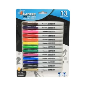 Marcador permanente Lancer punta conica x 12 colores + 1 metálico