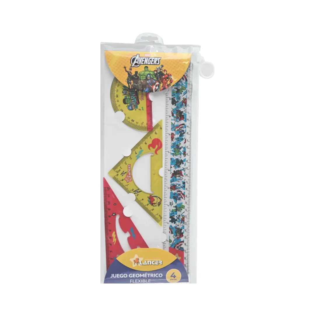 Juego Geométrico Lancer Flexible Avengers de 4 piezas, incluye regla , escuadra y transportador. Diseño resistente, flexible y con gráficos de los Avengers. Ideal para matemáticas, geometría y dibujo escolar. Envíos a todo el Ecuador.